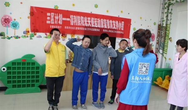 2018年4月19日,“三区计划”项目社工为阜阳市社会儿童福利院的孩子们开展了第五节阳光天使运动康复教育支持小组活动,这也是本次运动康复教育支持小组的最后一次活动。孤残儿童运动康复教育支持小组为组员创造了一个面对面的密切沟通的环境,组员们在这样一个环境中认识自我与他人,激发了组员们的运动能力。