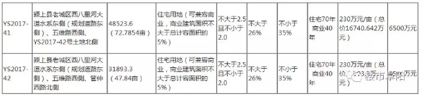 (5)竞得人须自《国有建设用地使用权出让合同》签订之日起5个月内实质性开工建设, YS2017-41号土地竞得人,工程建设自开工之日起24个月内竣工; YS2017-42号土地竞得人,工程建设自开工之日起18个月内竣工。两宗土地其他指标及建设内容详见颍上县城乡规划局规划设计条件通知书。