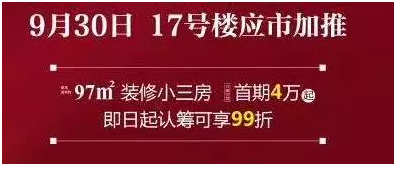 首期4万起,认筹可享99折,虽然力度不大,起码也是在一定程度上主动寻求降价来增加竞争力!