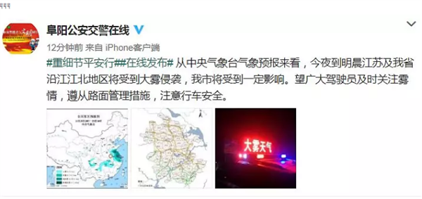 阜阳交警也发布了出行提示,提醒广大驾驶员及时关注雾情,遵从路面管理措施,注意行车安全。