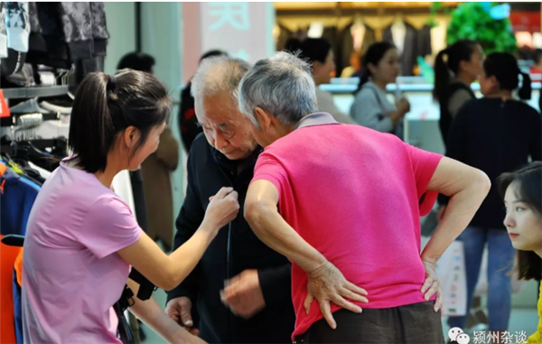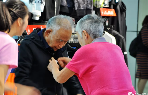 由于爱好摄影,闲暇的时候,总爱带着相机到处转转。这个国庆,在阜阳市百货大楼,我看见一对老年夫妇在三楼运动区域购物。说起来,在商场里,购物可算是常见的情景,但这一对老人从挑选服装、到试穿、再到付款的整个